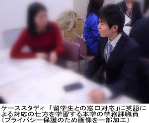 初めに主催者側より、秋田大学におけるグローバル化に対する基本方針の説明と、高等教育機関におけるグローバル化を担う人材育成の必要性などの説明、続いて「基本英会話講座」として外国人学生に対する基本的なコミュニケーションの知識と心構え、よく使われる会話内容などが説明されました。休憩をはさんで後半は、大学の学務系窓口での「よくある会話」を題材に参加者が小グループに分かれて「留学生の質問に対して英語で窓口対応をする」というケーススタディを行いました。最後に秋田大学が英語学習支援のために設置している「ALL ROOMS」の学生スタッフより施設の紹介と学習方法「ディクテーション」「シャドウイング」の説明ののち、全員で体験しました。本学には外国人留学生は在籍していないため、日ごろ窓口対応における英語の必要性を感じる機会は少ないものの、毎年の夏休みには学生たちにオーストラリアへの語学研修プログラムを実施し、また看護学部の授業科目として「海外看護演習」を設けています。本学も今後グローバル化を担う人材育成に取り組んで行く必要性と、SD活動の継続的な実施の重要性を再認識した良い経験でした。お世話になった秋田大学の皆さまへ、この場を借りてお礼申し上げます。(FD・SD委員会)