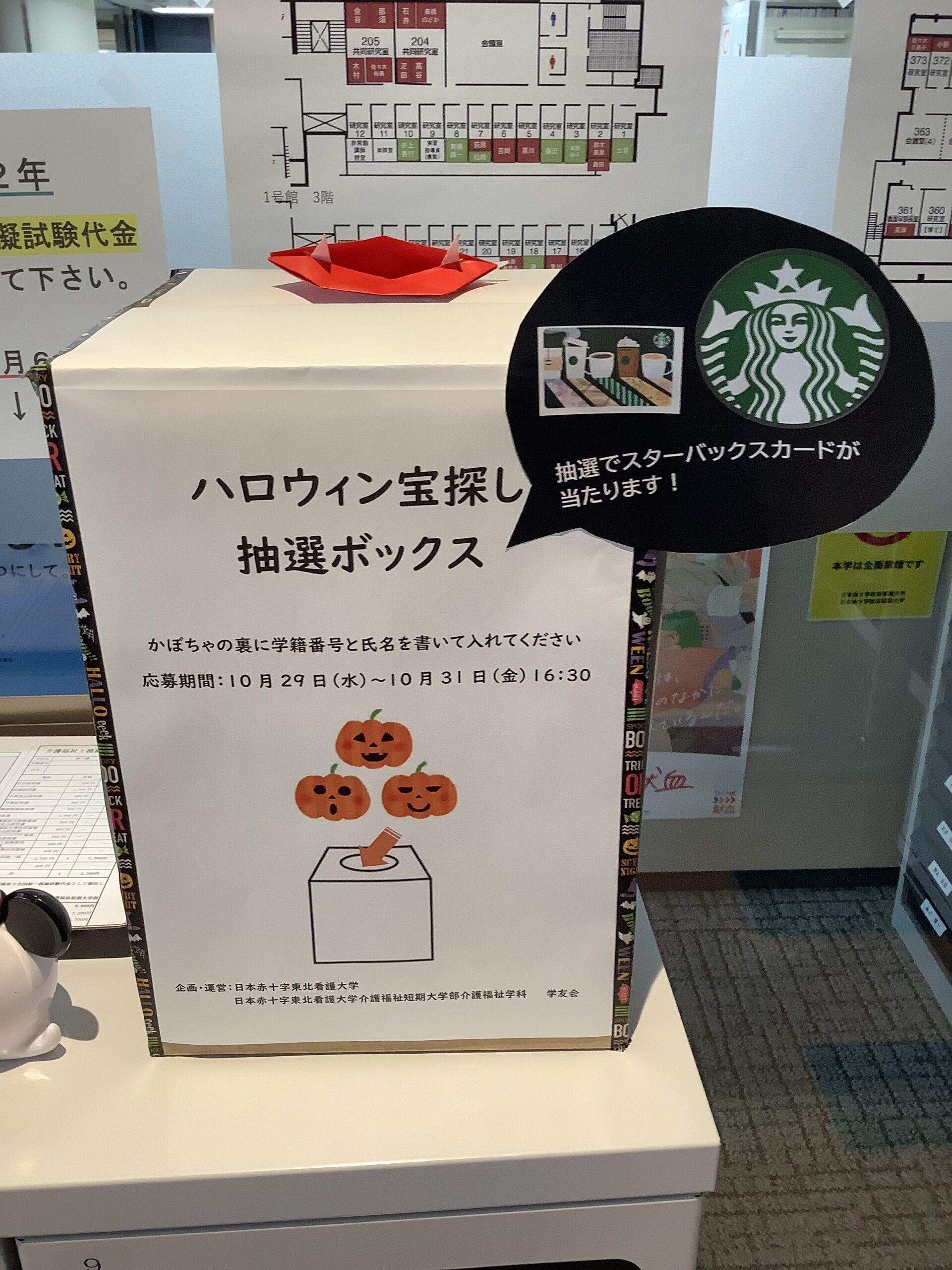 また、学内数か所に設置された“おばけかぼちゃ”や“コウモリ”など、ハロウィンにちなんだアイテムを探す「ハロウィン宝探し」も同時開催。見つけた方の中から抽選で素敵なプレゼントが贈られました