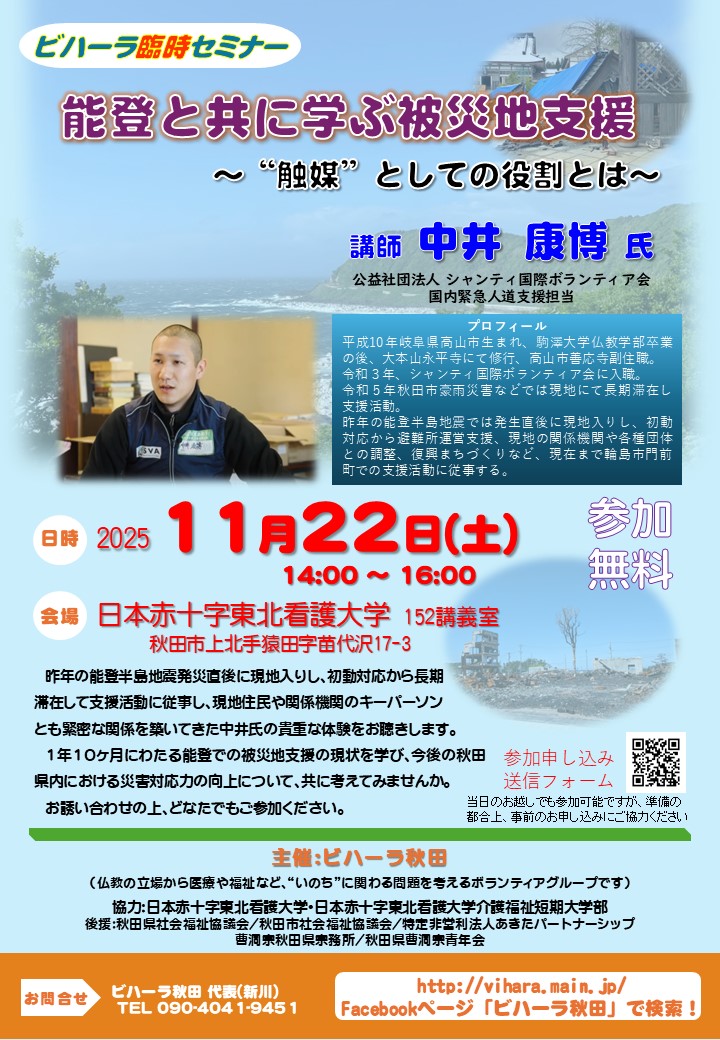 ビハーラ秋田主催セミナー「能登と共に学ぶ被災地支援 ~ ❝触媒❞ としての役割とは~」が本学で開催されます!