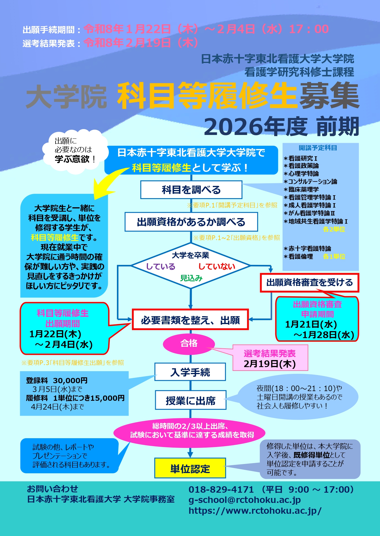 下記のとおり、令和8年度前期 大学院 科目等履修生 を募集します。
