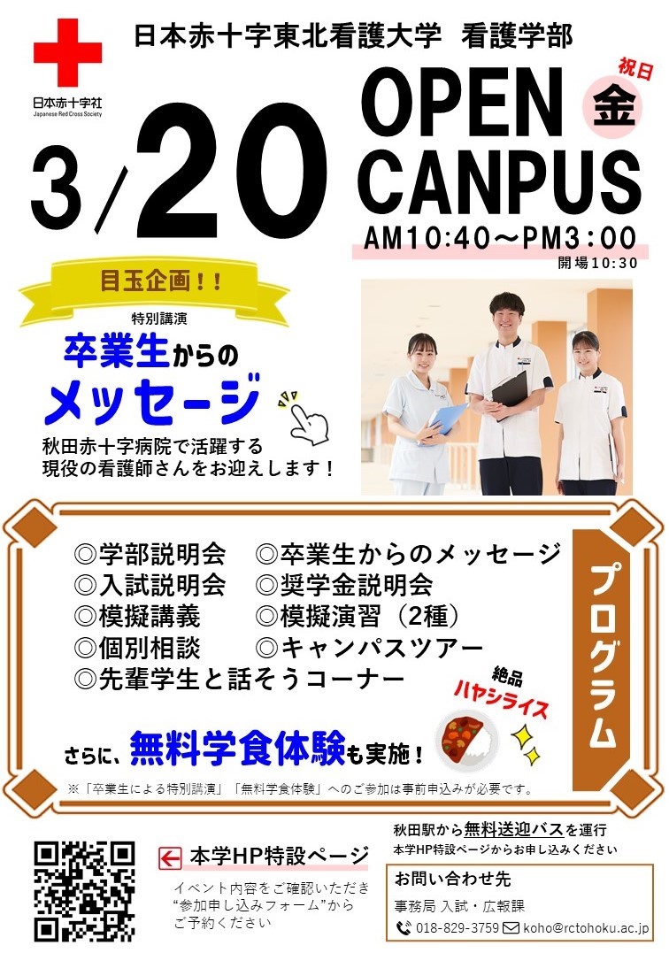 3月の目玉企画は「(特別講演)卒業生からのメッセージ」です!秋田赤十字病院で活躍している現役の看護師さんをお迎えして、講演会をおこないます。学生時代の学びや、プロとしての仕事のやりがいを聞ける絶好の機会です。 卒業後の自分をイメージするために、ぜひ保護者様とご一緒にお聞きください。さらに、もう一つの目玉企画として「無料学食体験」も実施します!キャンパスライフの雰囲気も、ぜひ味わってみてください。
