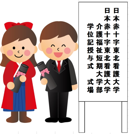 • 学位記授与式(卒業式)の立て看板は、ミルハスの正面玄関(メインエントランス)の左側に設置予定です。なお、大学正面玄関には立て看板は設置いたしませんので、大学での写真撮影を予定している方はご注意ください。